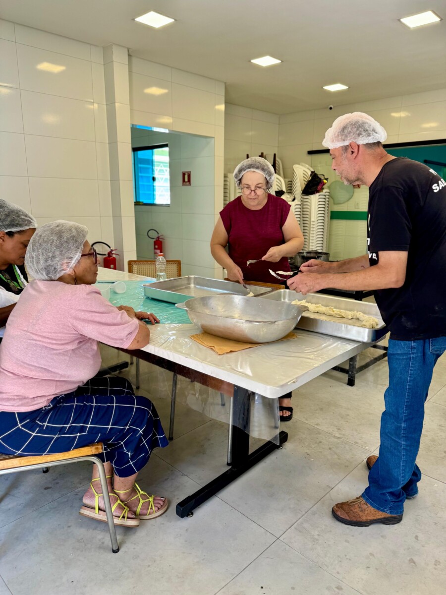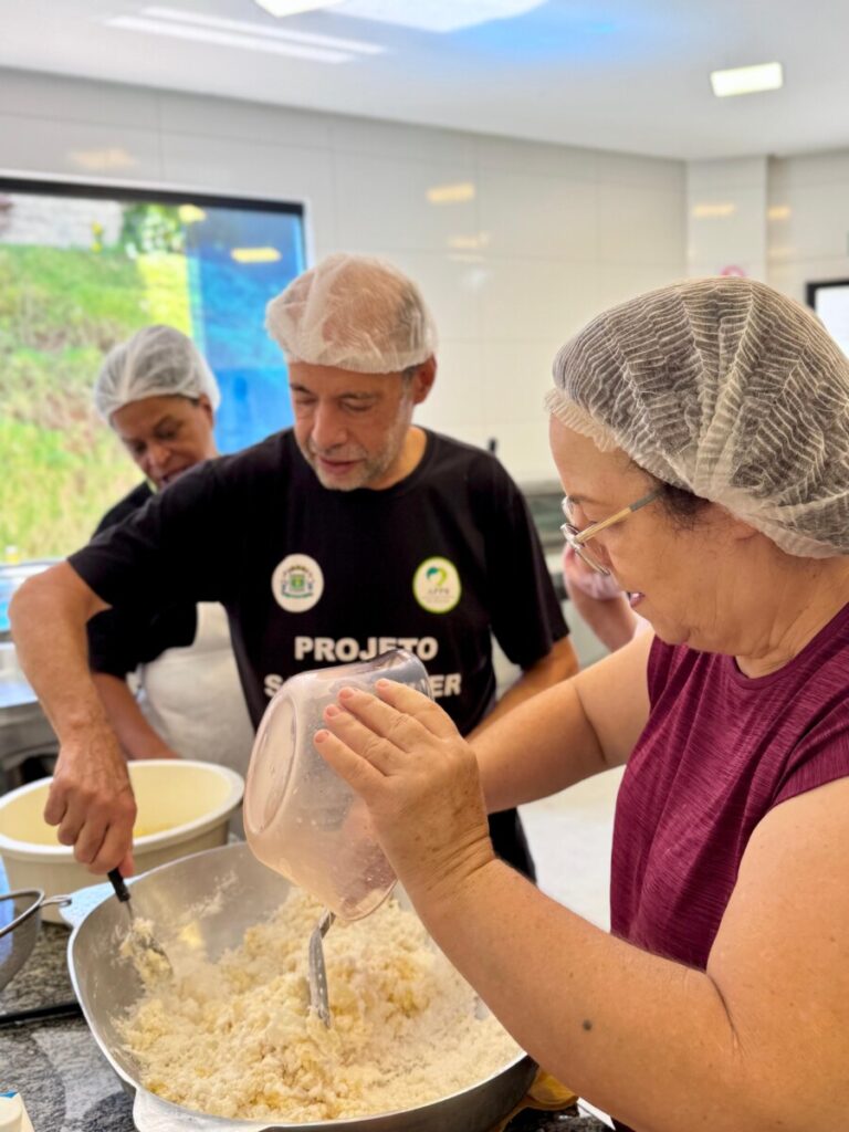 A receita do dia foi a clássica rosca de polvilho, preparada pelo Sr. Dilson, que conduziu o grupo em um passo a passo cheio de memórias afetivas e sabores típicos. De forma participativa, os integrantes colocaram literalmente a mão na massa e produziram biscoitos deliciosos, despertando risadas, troca de experiências e aquele clima acolhedor que já é marca registrada do projeto.